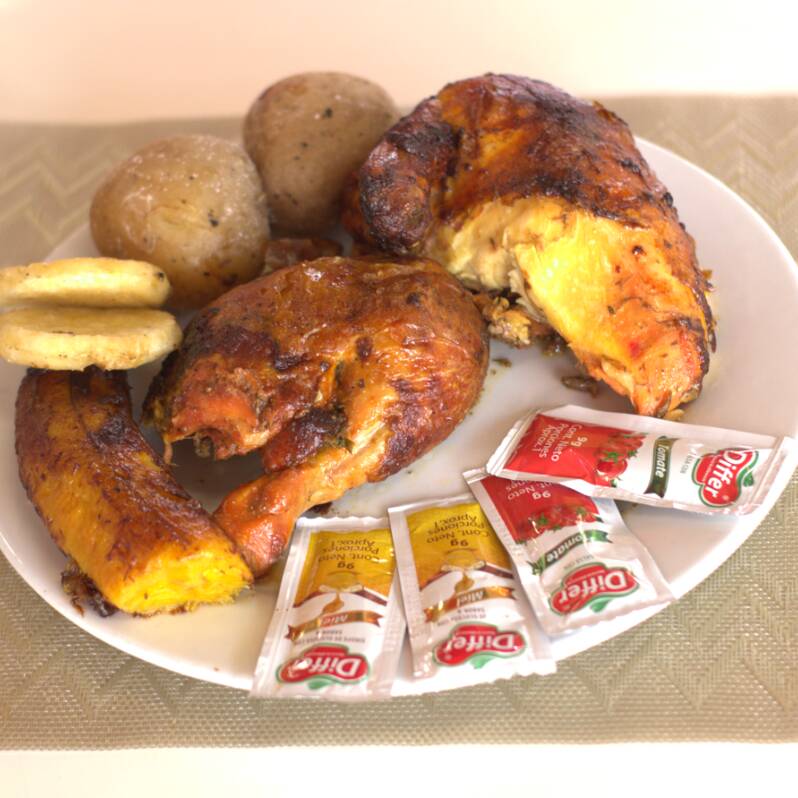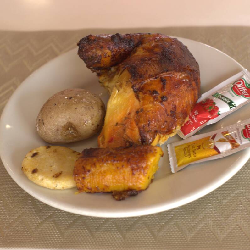 Medio pollo asado, acompañado de papas cocidas, arepas y maduro.