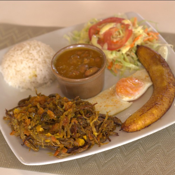 Carne desmechada, acompañada de sopa, arroz, frijol, maduro, huevo, ensalada y jugo del día.