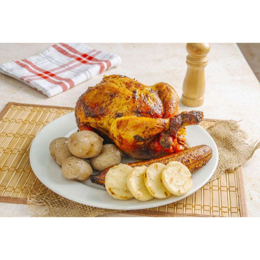 Pollo asado, acompañado de papas cocidas, arepas y maduro.
