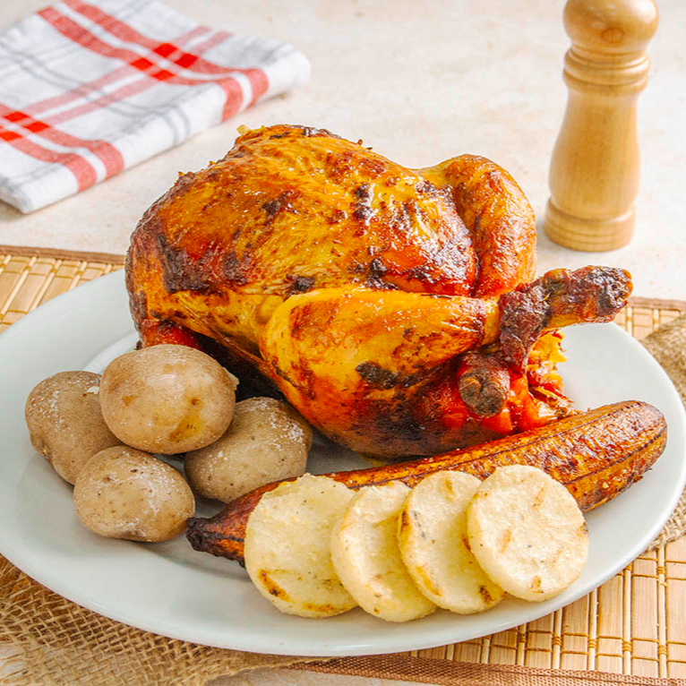 Pollo asado, acompañado de papas cocidas, arepas y maduro.