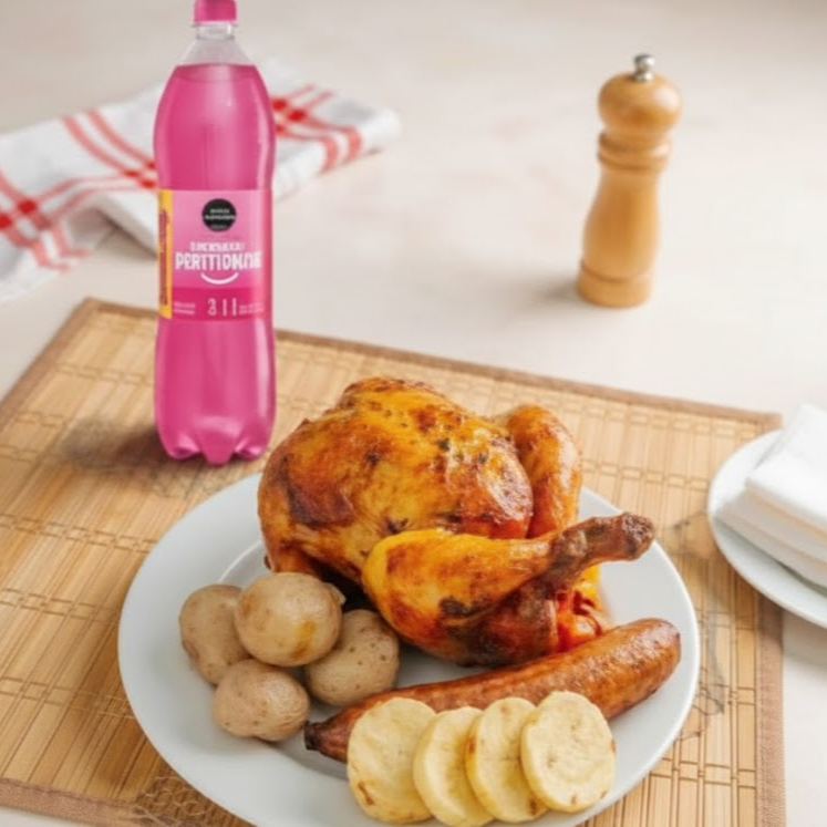 1 Pollo asado acompañado de 1 porción de papa cocida, 1 porción de arepas, 1 maduro y gaseosa 1L