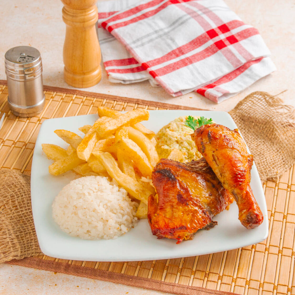 Dos presas asadas, acompañadas de arroz, papas a la francesa y ensalada dulce.