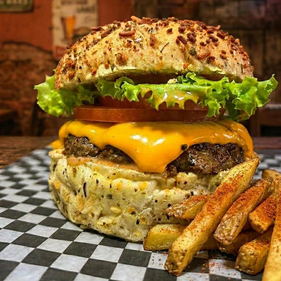 ¿fanatico del queso? pan orégano-parmesano sellado en mantequilla, 120g de carne de res artesanal, queso cheddar, mozzarella fundida y la cremosidad del queso crema, acompañada de tocineta ahumada y el dulce de nuestra cebolla caramelizada artesanal, acomapñada de papas a la francesas