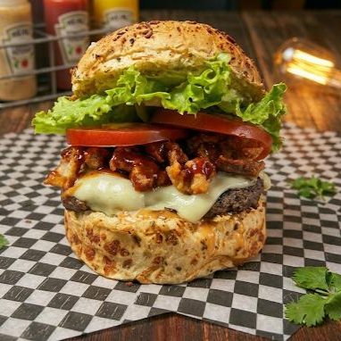 Nuestra propuesta mas audaz. 120g de carne de res artesanal con una capa de queso mozzarella, lechuga, tomate y queso crema, coronada con trozos de chicharron carnudo bañados en nuestra exclusiva reduccion de BBQ de vino tinto de la casa y pan orégano-parmesano sellado en mantequilla.