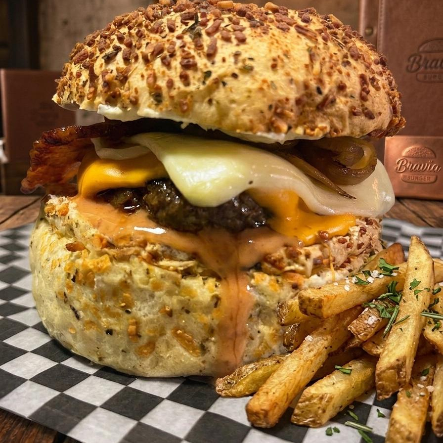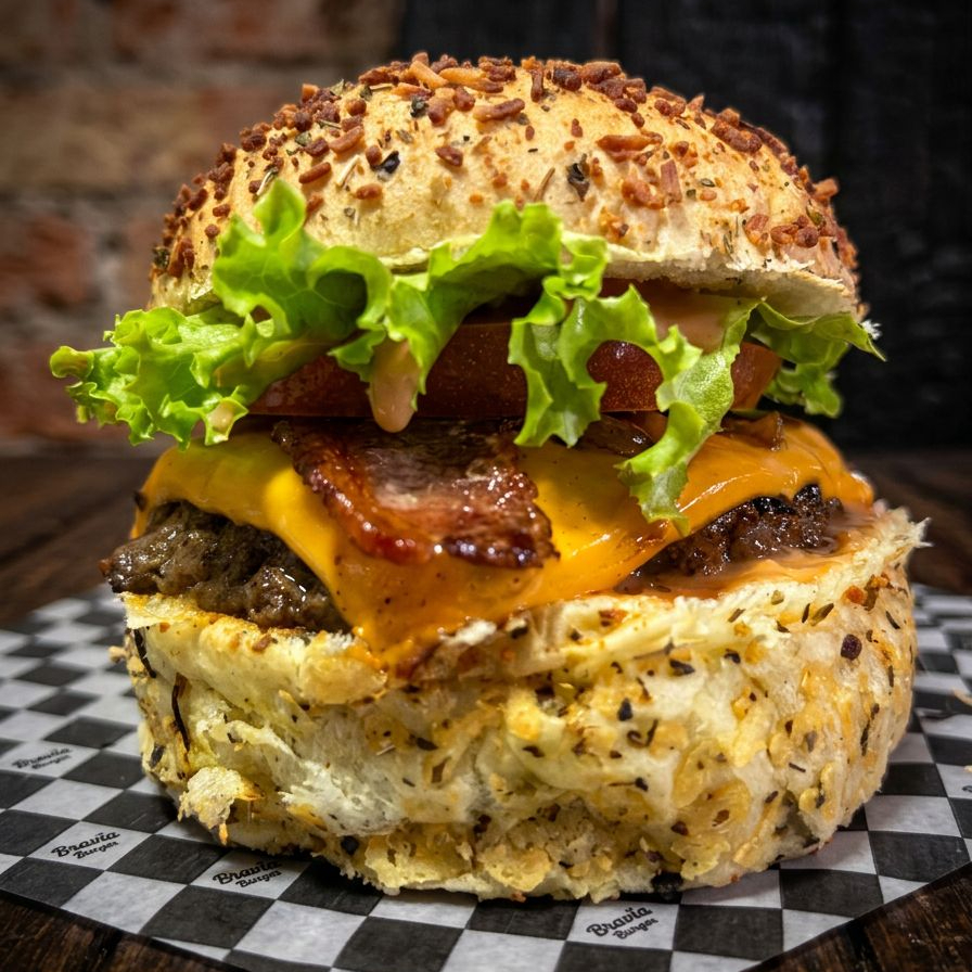 ¡La Bravia Clásica! 120g de carne de res 100% artesanal, asada a la perfección y coronada con queso mozzarella fundido. Servida en un pan orégano-parmesano artesanal suave y doradito, con lechuga fresca, tomate y el toque secreto de Bravia: nuestra irresistible salsa de Mayo-Cilantro de la casa + papas artesanales