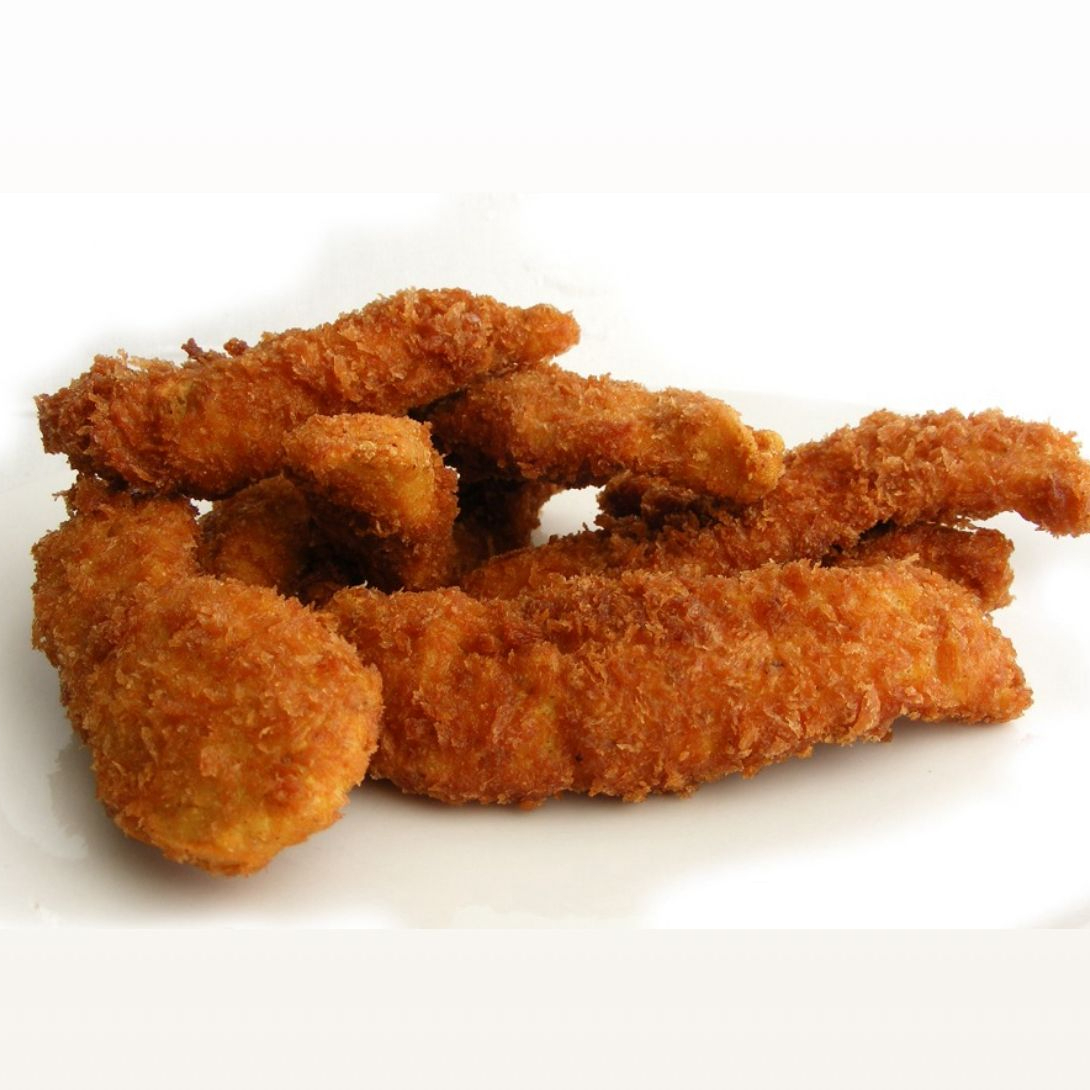 Deliciosas tiras de pechuga de pollo apanadas acompañadas de mayocilantro de la casa.