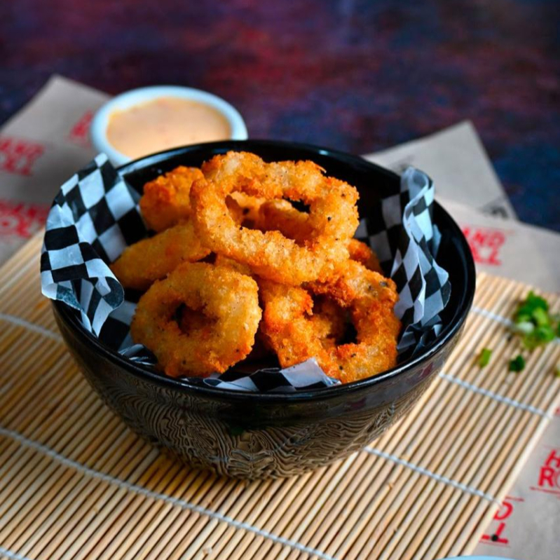 8 Unidades de aros de cebolla apanados acompañados de salsa mayocilantro.