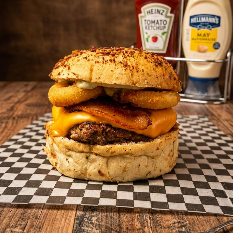 120 gramos de carne de res artesanal seleccionada, bañada en una reduccion de BBQ de vino tinto de la casa, tocineta ahumada, queso cheddar. Coronada con aros de cebolla crocantes y nuestra iconica mayo cilantro Todo en orégano-parmesano sellado con mantequilla. .