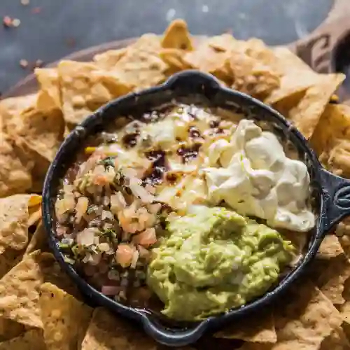 Nachos, chilli con carne molida gratinada con queso mozzarella, pico de gallo, guacamole, maicitos y sour cream.