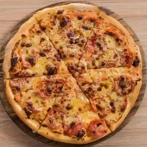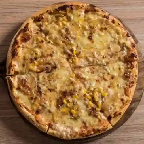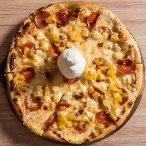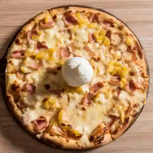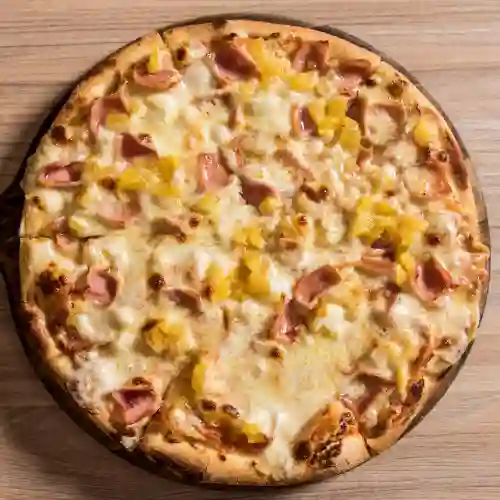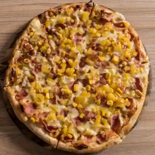 Base napolitana, mozzarella, jamón de cerdo, piña, tocineta y maicitos.
