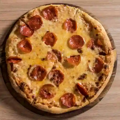 Pizza con base napolitana, mozzarella y pepperoni.