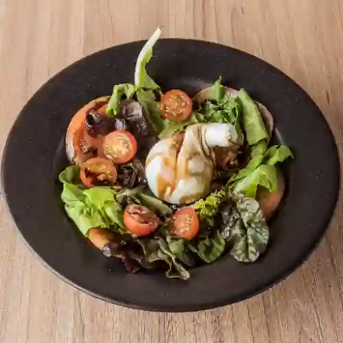 Queso burrata, tomates cherry, tomate en julianas, rúgula y reducción de balsámico.