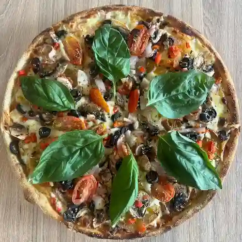 Base napolitana, queso mozzarella, tomate en rodajas, champiñones, tomate cherry, cebolla morada, aceitunas negras, pimentón, albahaca y especias
