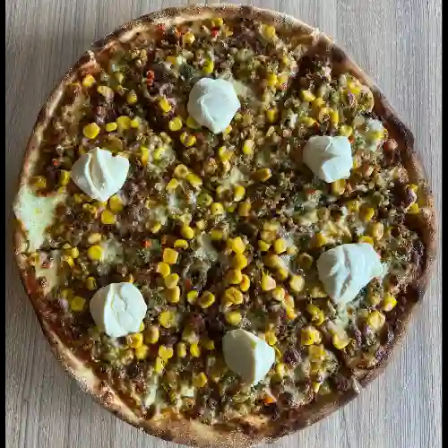 Base napolitana, mozzarella, carne de res molida, maicitos, jalapeños, pimentón, cebolla morada, cebolla blanca, cilantro, todo finamente picado y finalizada con toque de sour cream.