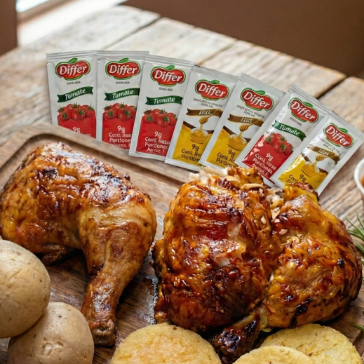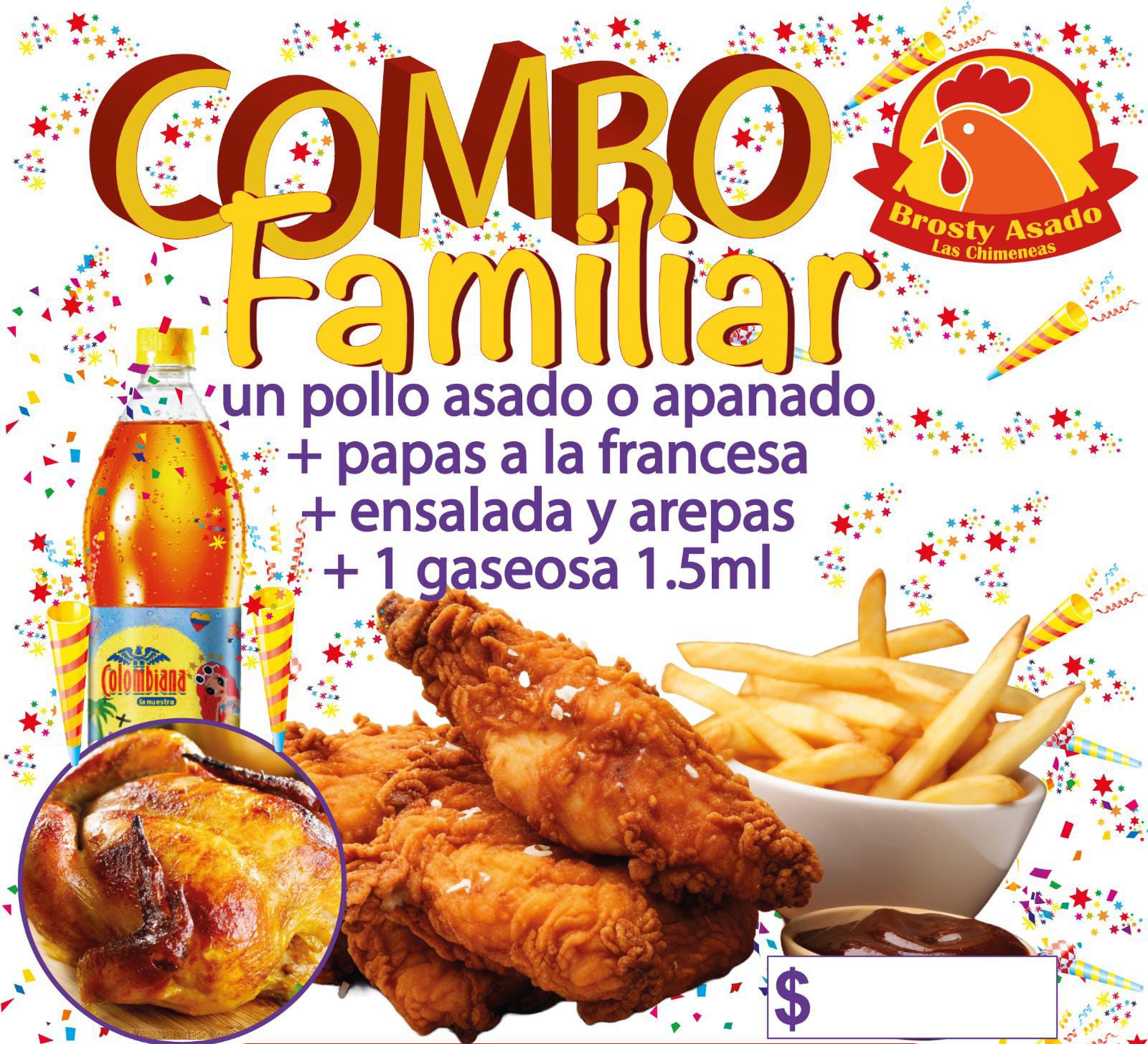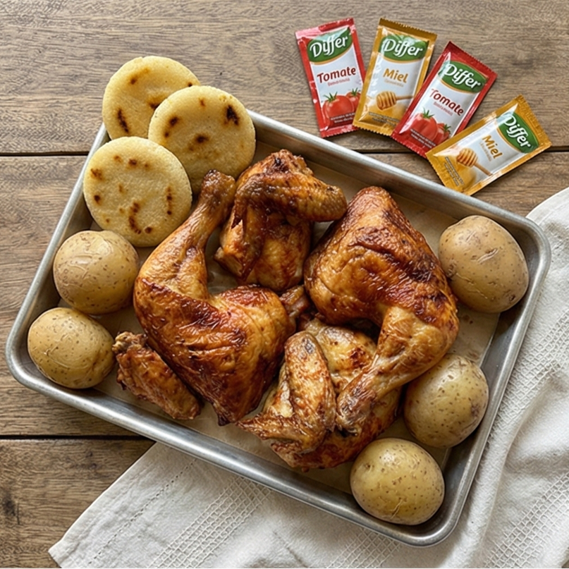 1 pollo entero, 1 porción de papas fritas, 1 porción de ensalada dulce, 8 papas al vapor, 8 arepas, 1 gaseosa 1.5, salsa de tomate y miel