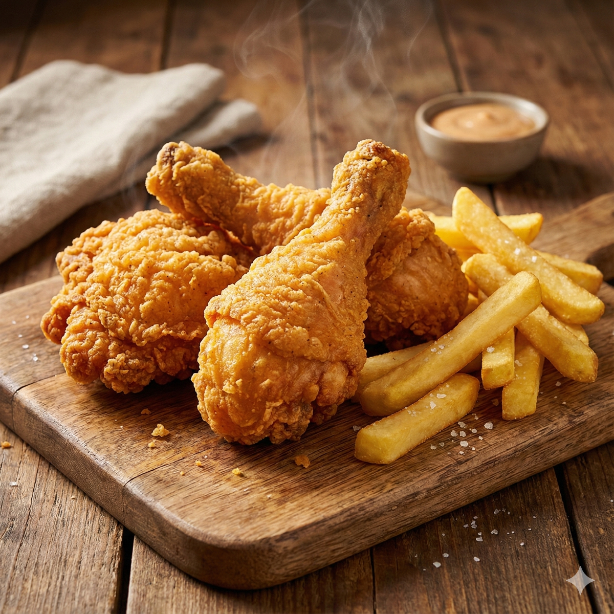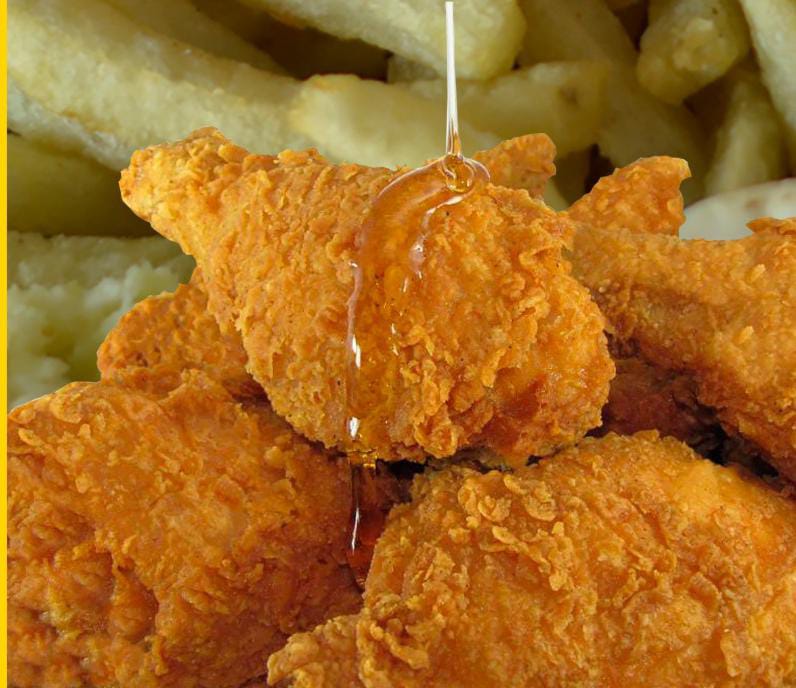 3 presas de pollo apanado mas una porcion de papas a la francesa