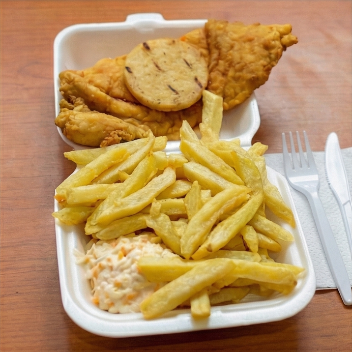 2 presas, ensalada dulce, papas a la francesa y arepa