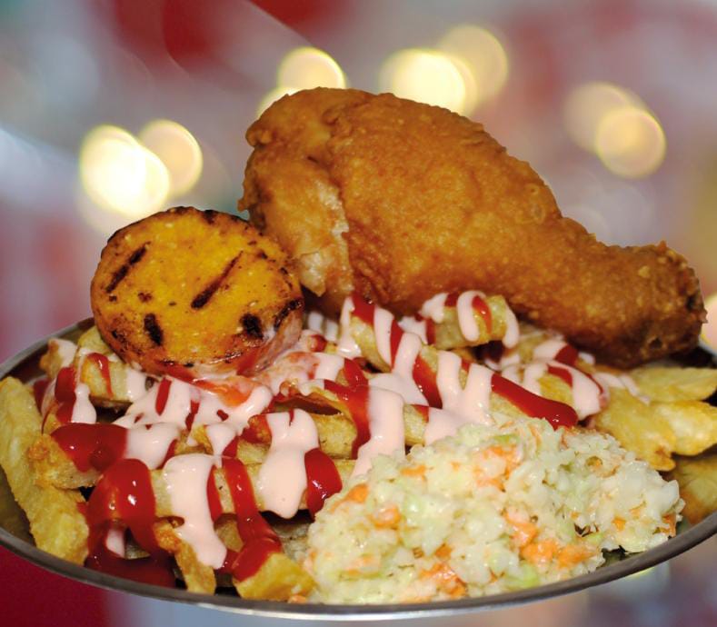 2 presas, ensalada dulce, arepa, papas a la francesa.