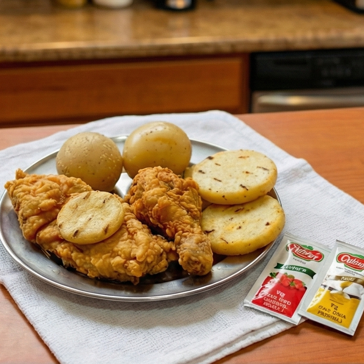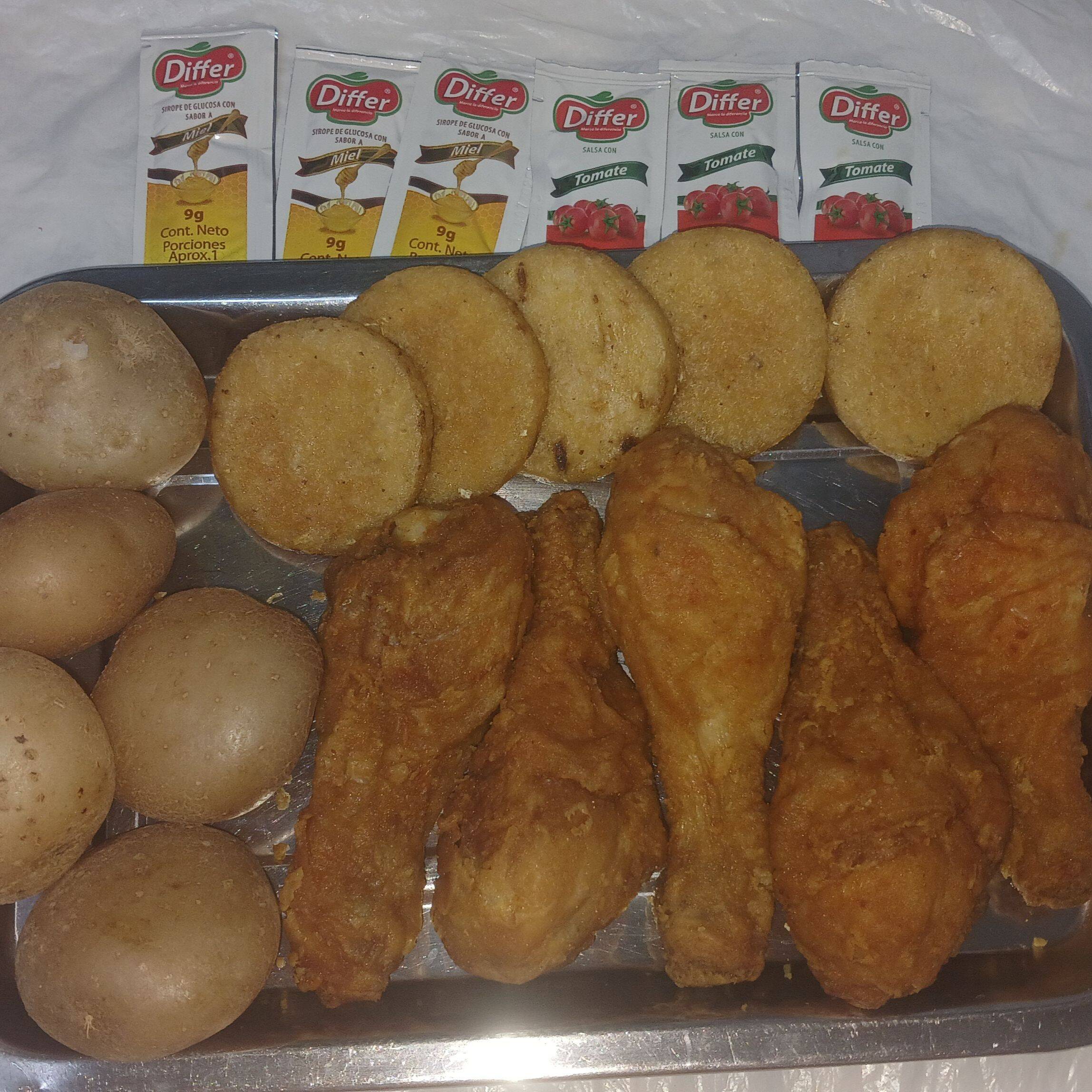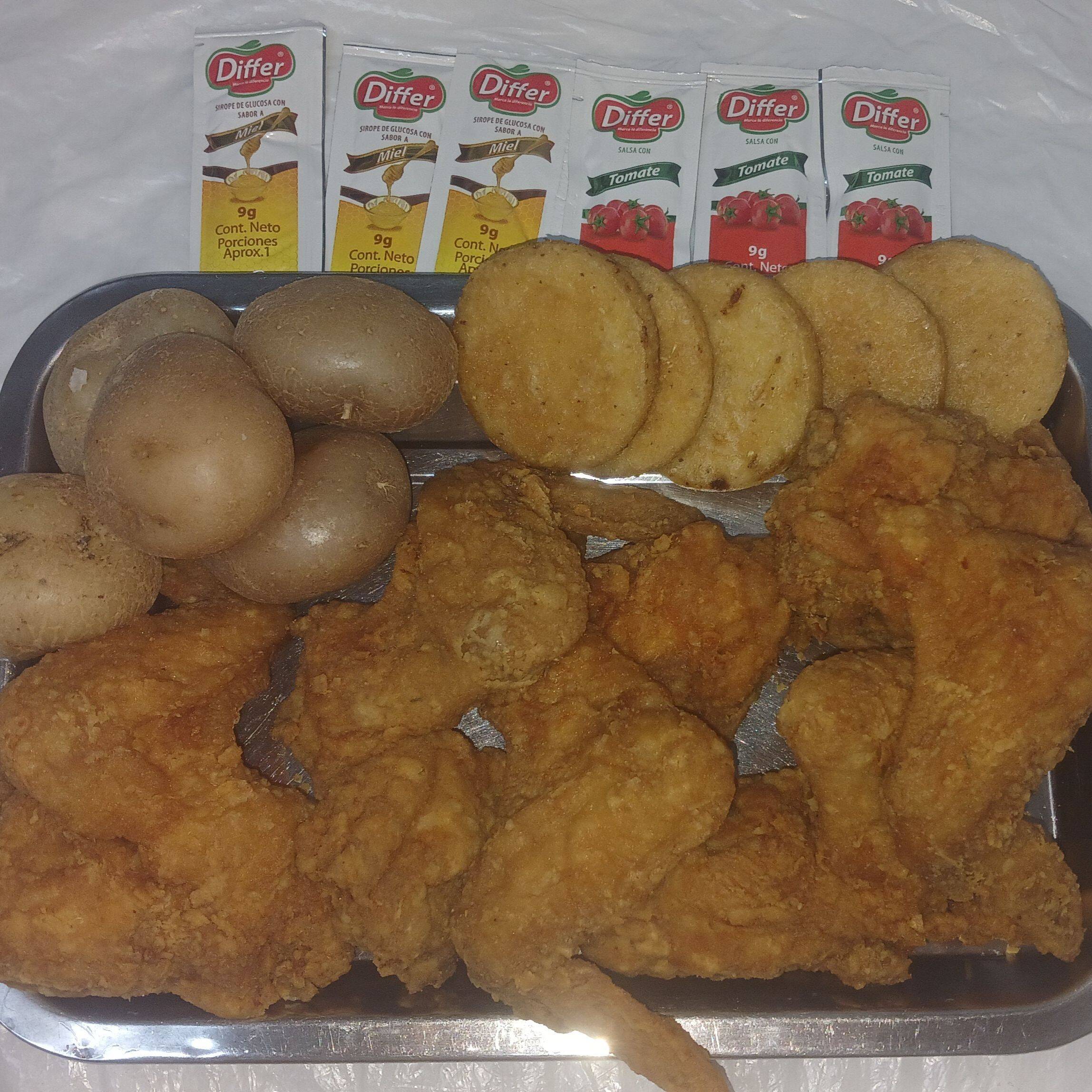 5 muslos, 5 arepas, 5 papas al vapor, miel y salsa de tomate