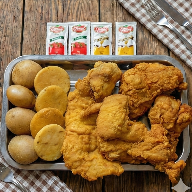 4 presas, 4 papas al vapor, 4 arepas, salsa de tomate y miel.