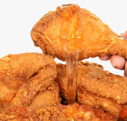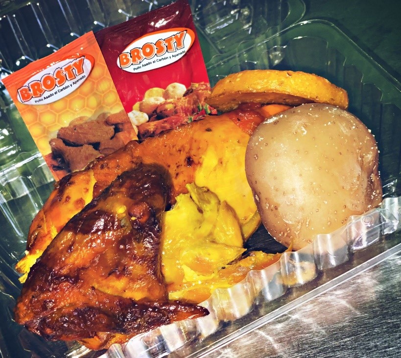 8 presas de pollo Broaster, 4 arepas, salsas y miel.