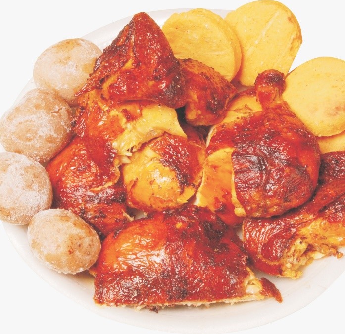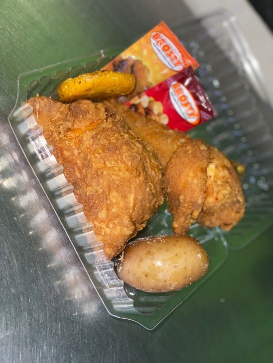 Cuarto de pollo, 2 presas ,1 arepa, 1 papa, salsa y miel.