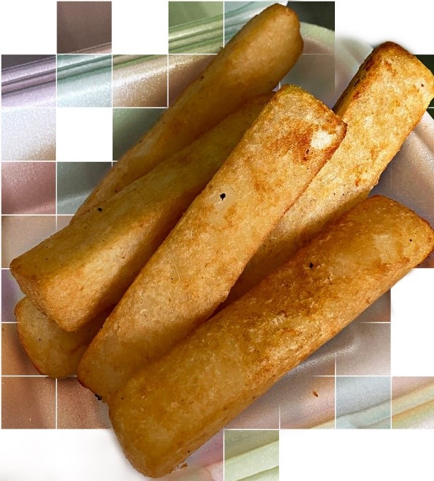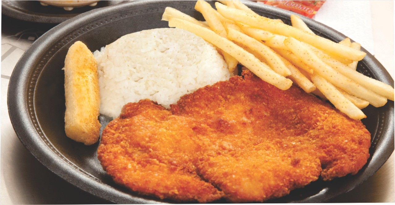 Arroz, yuca, 1/2 porcion de papas francesa y ensalada brosty.