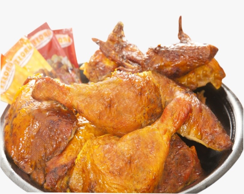 8 presas de pollo Broaster, 4 papas, 4 arepas, salsa y miel.
