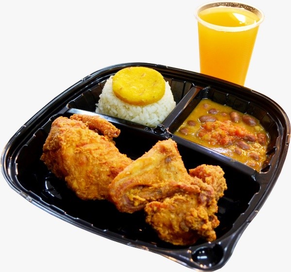 1/4 de pollo apanado, porcion de frijol, porcion de arroz, arepa y jugo natural.