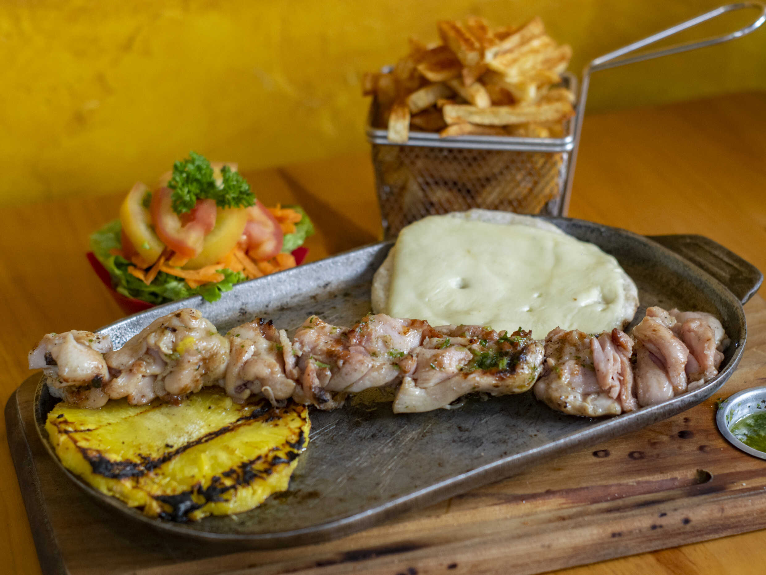 Disfruta un delicioso chuzo de pollo a la plancha, acompañado de papas fritas crocantes, arepa con queso fundido, ensalada fresca . ¡Un plato que lo tiene todo en un solo combo!