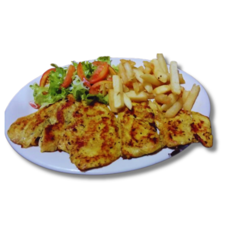 Disfruta un jugoso filete de pollo a la plancha, acompañado de papas fritas crocantes, ensalada fresca, piña asada con un toque dulce y una arepa con queso derretido. ¡Un plato completo y sabroso que te dejará más que satisfecho!