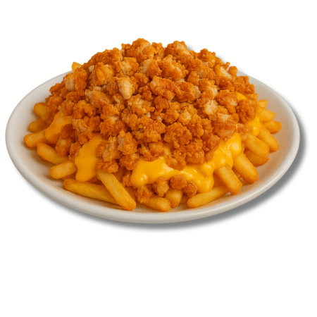 Disfruta una porción de papas fritas crujientes con pechuga de pollo apanada en trozos, acompañadas de nuestras exclusivas salsas de la casa. ¡Un clásico delicioso que nunca falla!”
