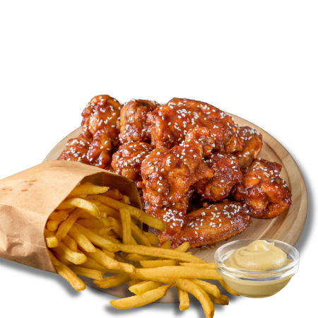 22 alitas crocantes bañadas en tu salsa favorita + papas fritas doraditas. ¡El combo perfecto para compartir y chuparse los dedos