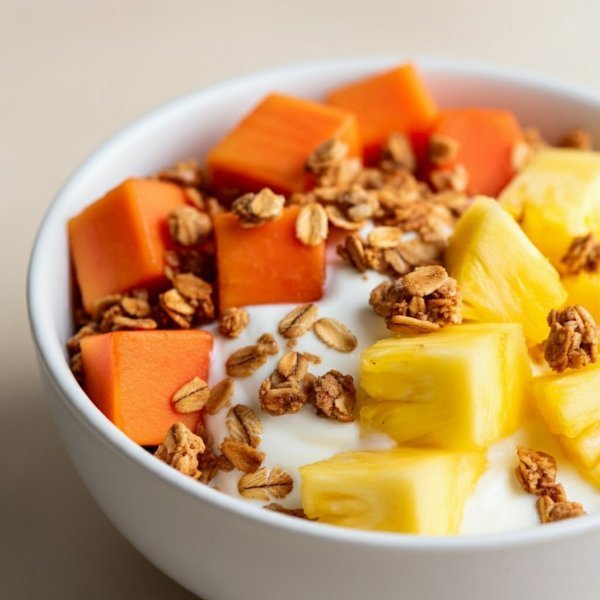 Bowl de fruta con papaya y piña, banano, yogurt y granola.