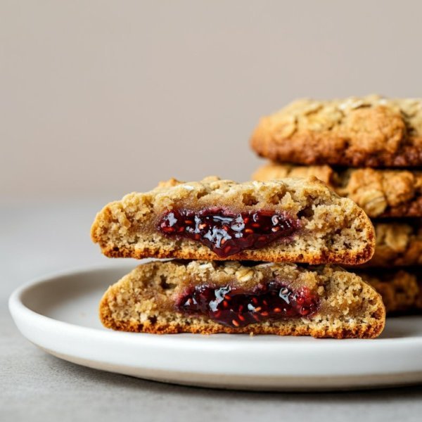 Galleta de avena con canela y relleno de frutos rojos.