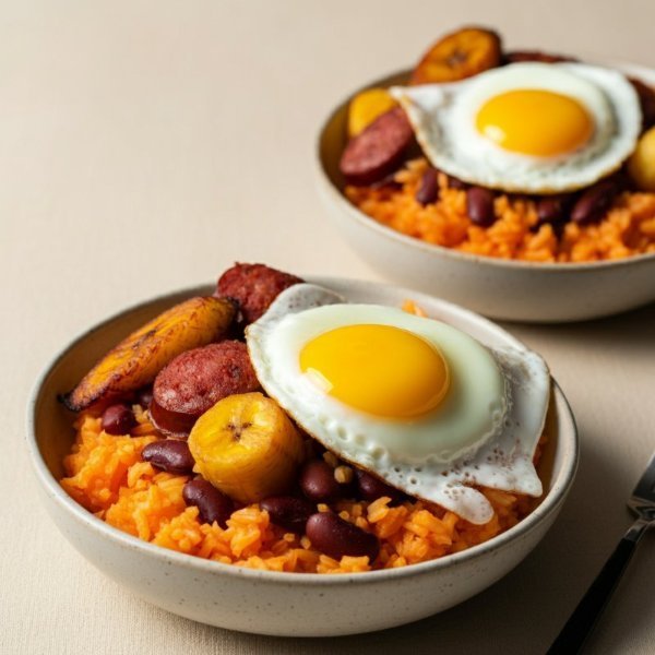 Calentado de arroz achiotado, frijol paisa, papa, chorizo satarrosano, maduritos y huevo frito.