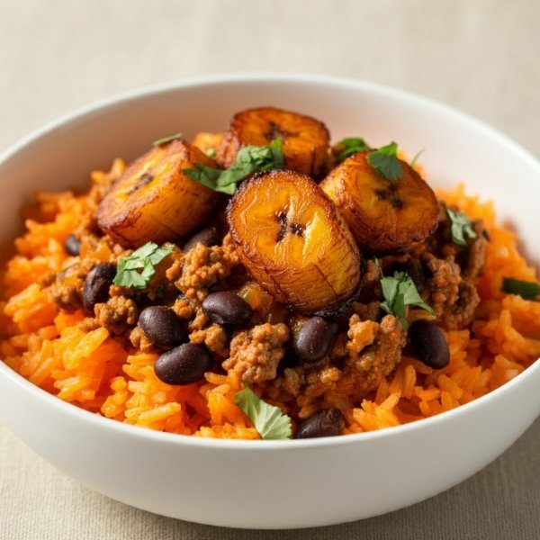 Calentado con arroz achiotado, carne molida, fríjoles negros, maduritos y cilantro.