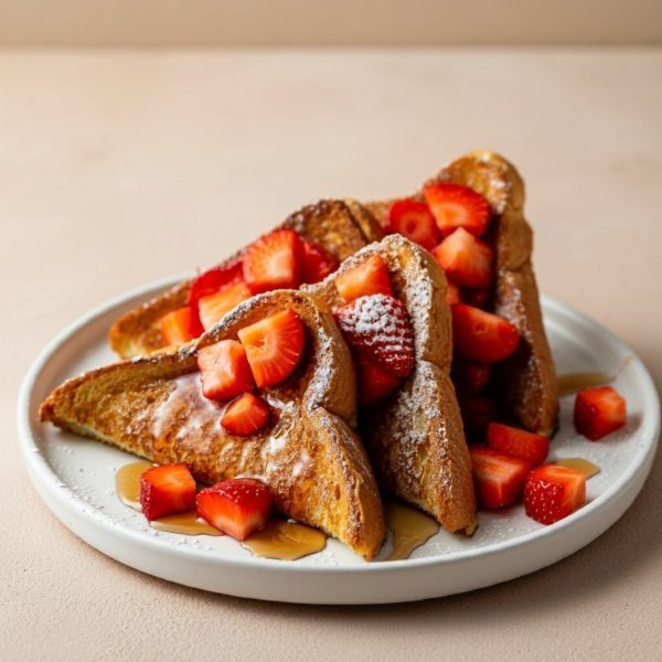 Tostadas francesas de pan brioche con fresas y miel de maple.