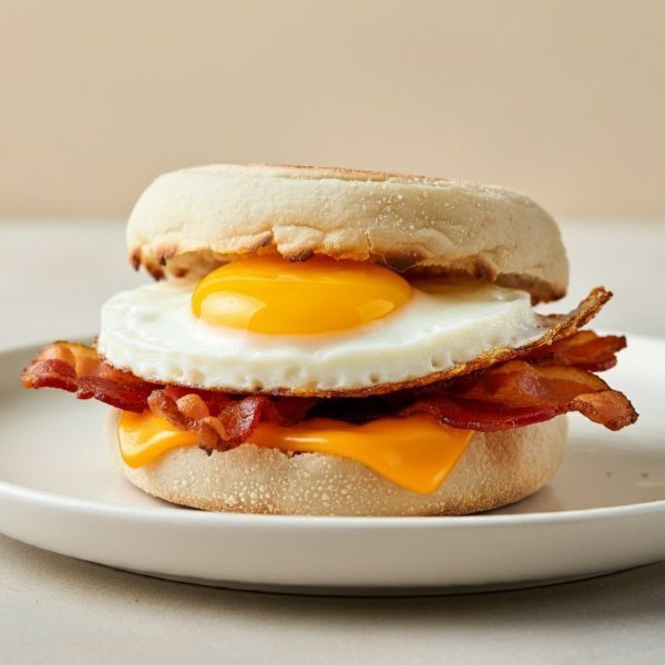 Muffin inglés con huevo frito, tocineta y queso cheddar.