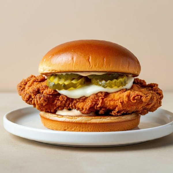 Sandwich de pollo apanado con queso americano y pepinillos.