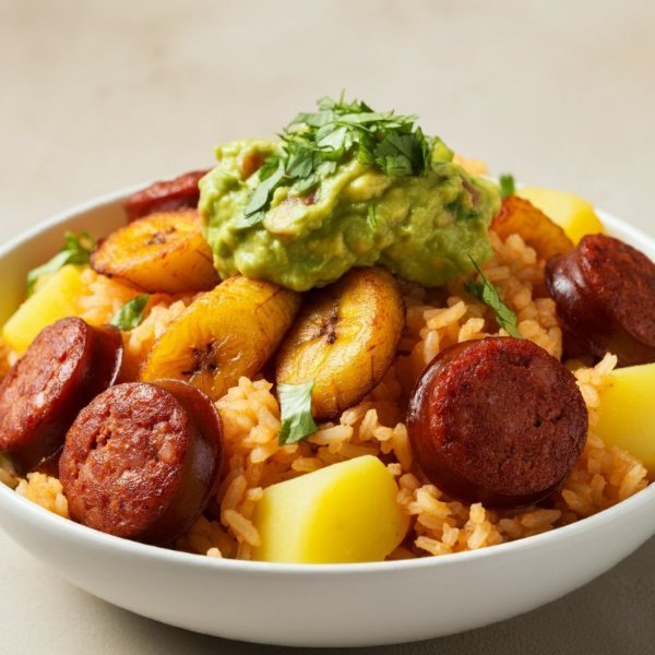 Calentado con arroz achiotado, chorizo santarrosano, maduritos, papa, guacamole y cilantro.