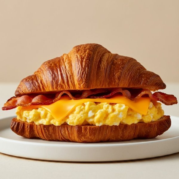 Croissant relleno con huevo revuelto, tocineta y queso cheddar.