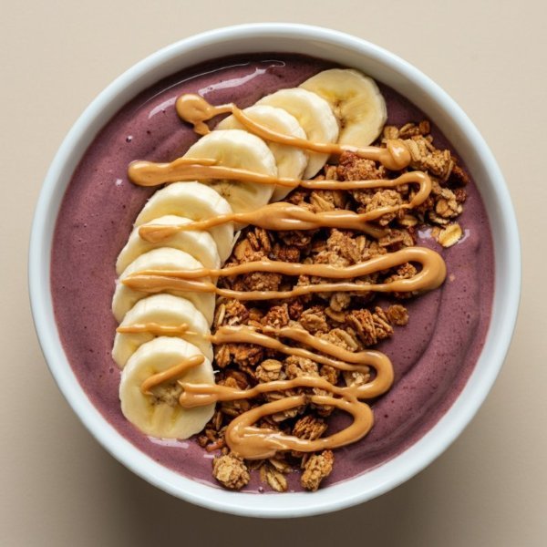 Bowl de açai con banano, mantequilla de maní y granola.