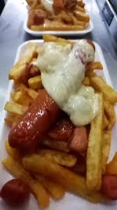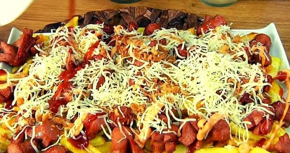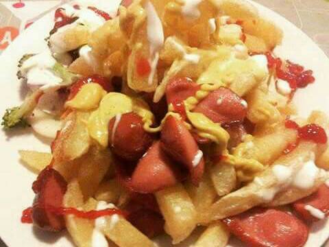 Salchipapas, res desmechada, salchichas, queso mozzarella o costeño, 2 huevos de codorniz, 2 chorizo coctelero y salsas de la casa.