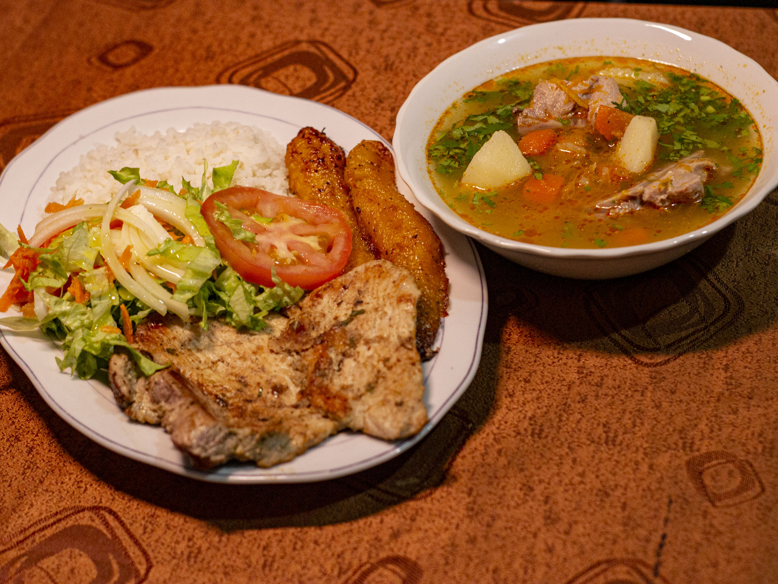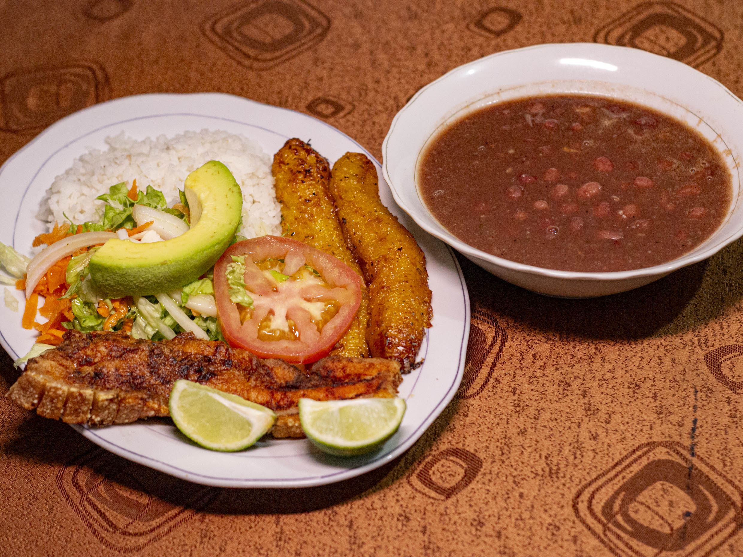 Arroz, Tajada de maduro, Ensada, Frijoles Acompañado de Sopa del Día y jugo