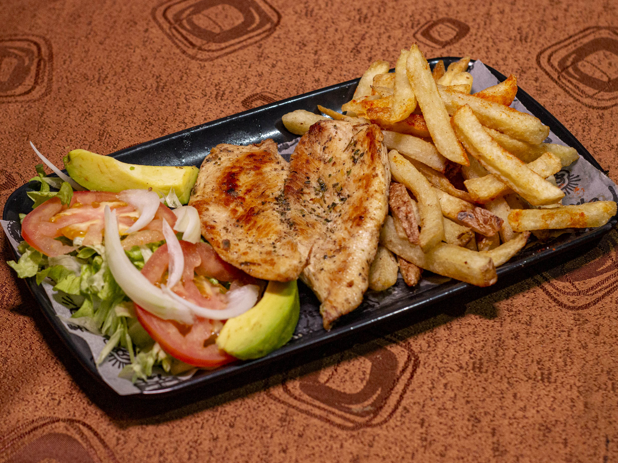 110g pollo a la plancha, arroz tajada de maduro, ensalada del día compañado de sopa del día o frijoles y jugo