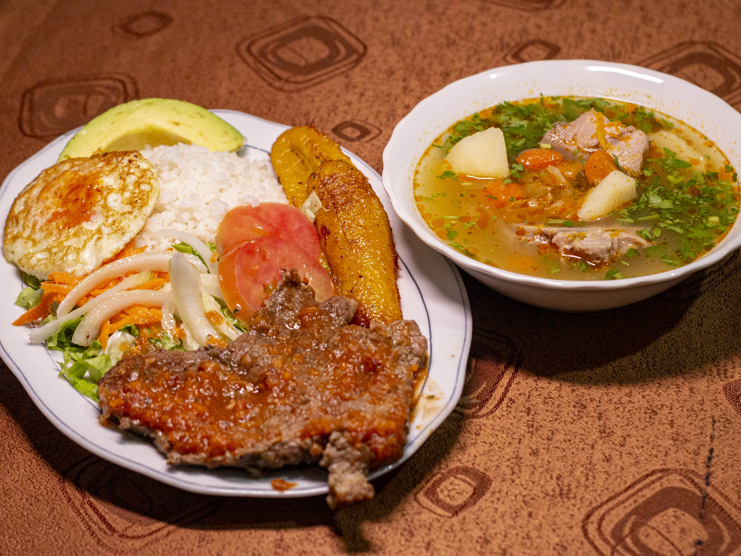 Incuye Arroz blanco, ensalada del día, 1 tajada de maduro, proteina a eleccion(pollo a la plancha, res cerdo, chicharron ), huevo acompañado de sopa del dia o frijoles (8 onzas ) y jugo de 9 onzas