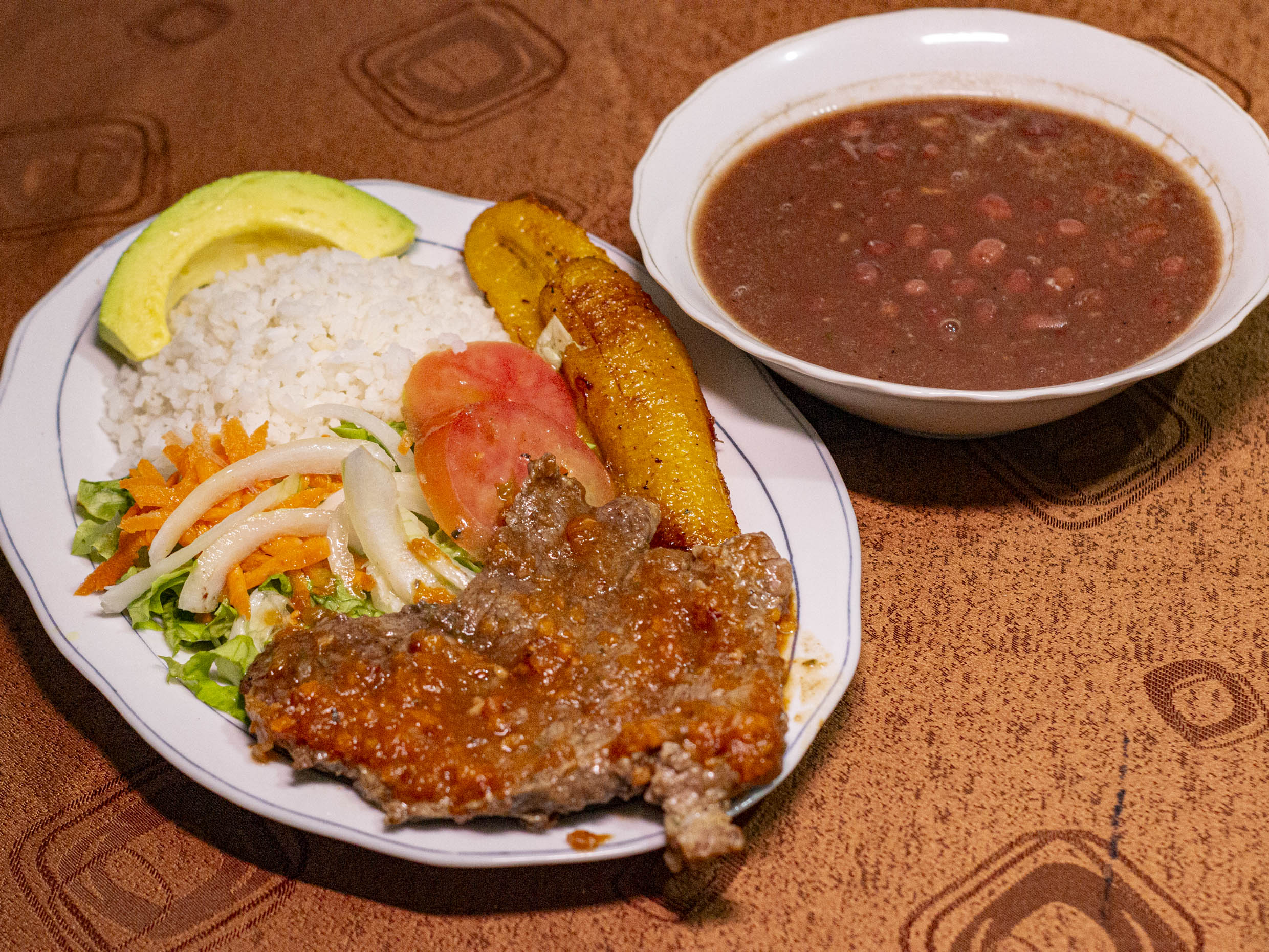 Res,Arroz blanco, tajada de maduro, ensalada del día, acompañado con frijoles o sopa del día (8oz) y jugo 9oz