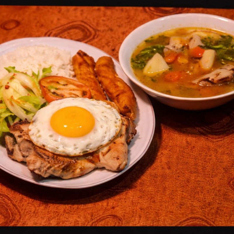 Arroz, Tajada de maduro, pollo a la plancha (100g) Ensalada del día, huevo, Acompañado de Sopa del Día o frijoles (8 oz)y jugo(9 oz)