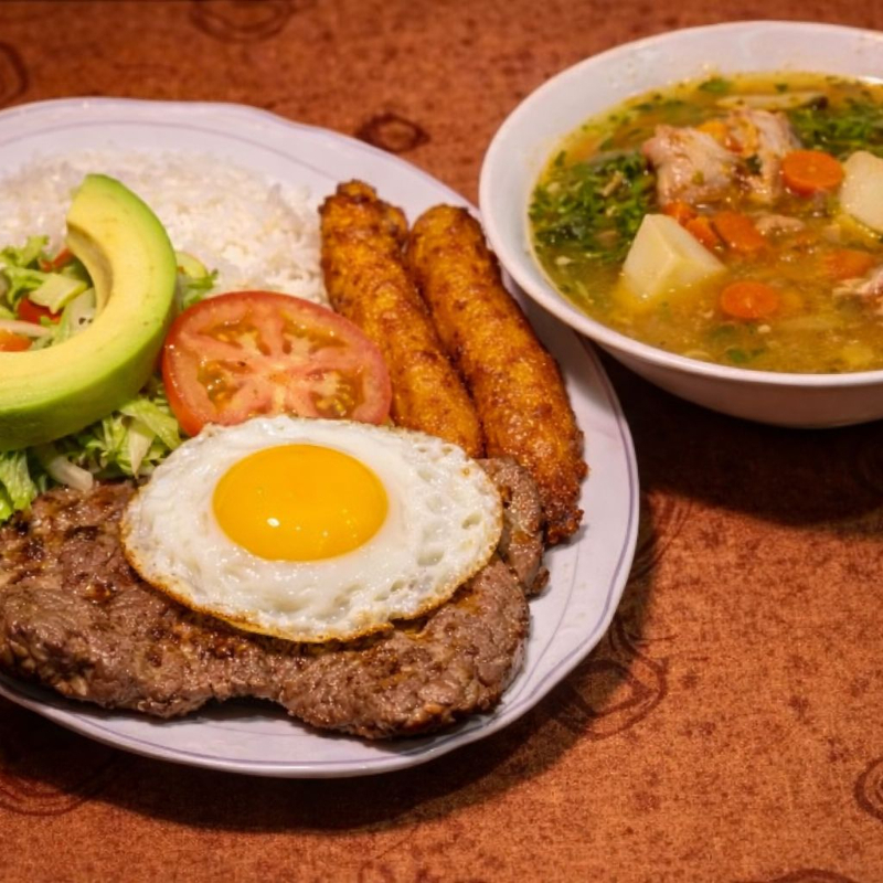 Res (100 a 110g), huevo, Arroz blanco tajada de maduro ensalada del dia acompañado de sopa del dia o frijoles (8 oz) y jugo